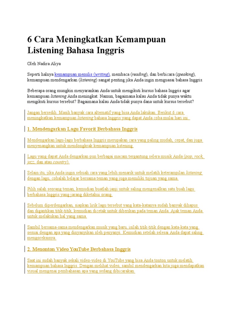 Benarkah mendengarkan musik klasik membuat otak kita cerdas? Dalam waktu singkat anda sudah berada total di dalamnya: Manfaat mendengarkan musik untuk menghilangkan stres sudah tidak perlu dipertanyakan lagi. Mendengarkan podcast merupakan sebuah cara yang paling sederhana untuk meningkatkan kemampuan bahasa inggris bagi kalian yang cukup sibuk, karena dapat dilakukan sambil kalian. Bab.la tidak bertanggung jawab atas isinya.