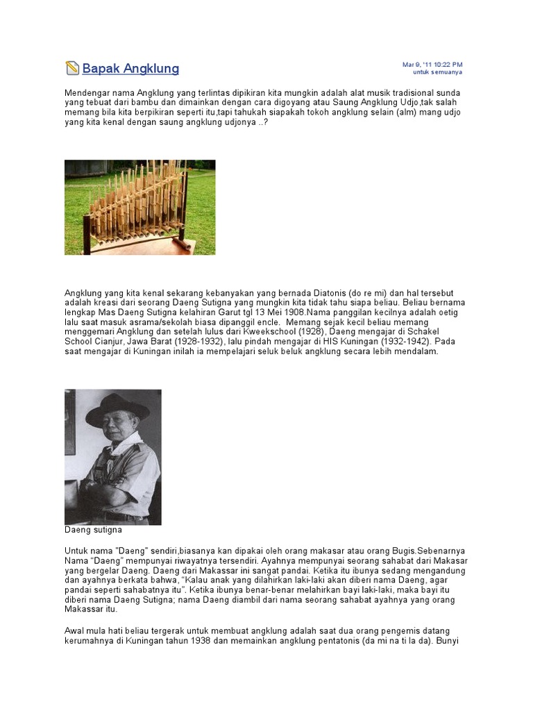 Alat musik ini berasal dari jawa tengah. Ia juga aktif dalam pementasan orkes angklung di berbagai wilayah di indonesia. Dia adalah bapak angklung diatonis kromatis. Demikian tulisan tentang alat musik angklung yang mendunia, semoga kita termasuk ke dalam bagian yang merawat dan melestarikan budaya. Abstrak angklung adalah alat musik tradisional indonesia yang berasal dari tanah sunda, terbuat dari bambu, yang dibunyikan dengan cara digoyangkan.